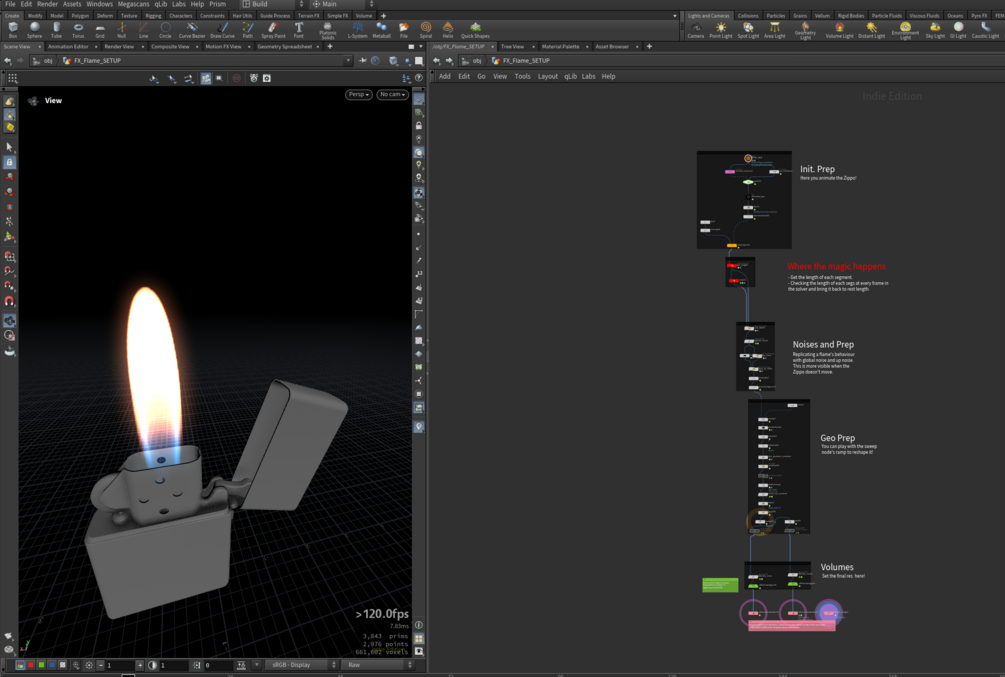 This Houdini project features a Zippo lighter flame FX, designed to look impressive directly in the viewport, without any rendering or compositing.